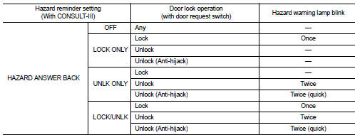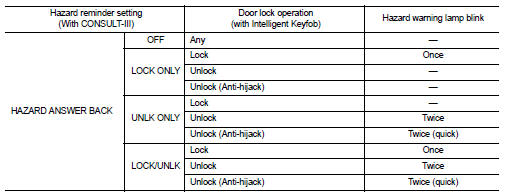 When doors are locked or unlocked by Intelligent Key, BCM blinks hazard warning lamps as a reminder.