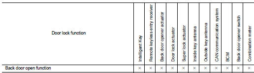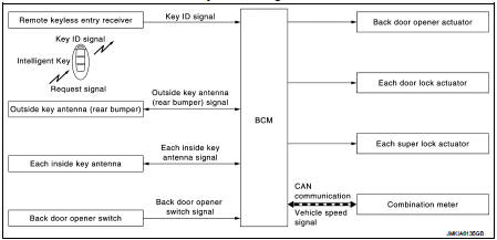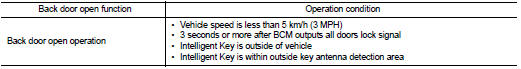 • When the BCM detects that back door opener switch is pressed, it starts the outside key antenna (rear bumper) and inside key antenna and transmits the request signal to the Intelligent Key. Then, check that the Intelligent Key is near the back door.