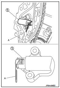 10. Remove timing chain tensioner with the following procedure: a. Insert a wire (A) (e.g. clip) into the top groove with the timing chain tensioner plunger pressed.
