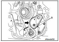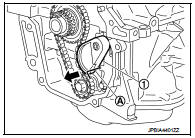 12. Remove crankshaft sprocket and oil pump drive component with the following procedure: a. Push oil pump drive chain tensioner (1) in the direction show in the figure (A).