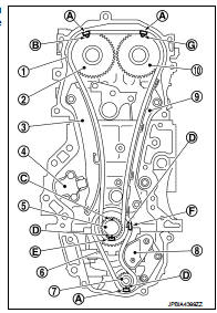 c. Check that matching marks of timing chain and each sprockets are still aligned. Then install front cover.