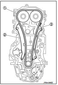 11. Remove slack guide (2), tension guide (3) and timing chain (1).