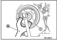 b. Attach a pulley puller [SST: KV11103000 ( — )] (A) in the M6 thread hole on crankshaft pulley (1), and remove crankshaft pulley.