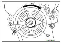 e. Put a paint mark (B) on crankshaft pulley (2), matching with any one of six easy to recognize angle marks (A) on crankshaft pulley bolt (1) flange.