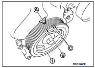12. Install crankshaft pulley with the following procedure: a. When inserting crankshaft pulley with a plastic hammer, tap on its center portion (not circumference).