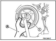 a. Fix crankshaft pulley (1) with a pulley holder (commercial service tool) (A), loosen crankshaft pulley bolt, and locate bolt seating surface at 10 mm (0.39 in) from its original position.