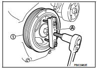 b. Secure crankshaft pulley (1) with a pulley holder (commercial service tool) (A).