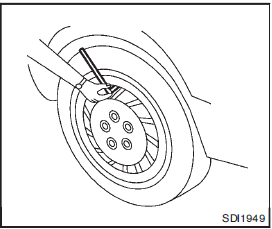 5. Add air to the tire as needed. If too much air is added, press the core of the valve stem briefly with the tip of the gauge stem to release pressure. Recheck the pressure and add or release air as needed.