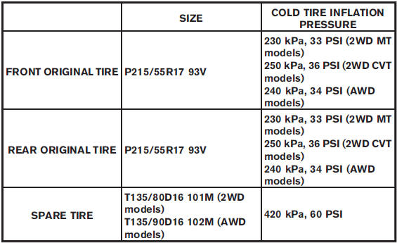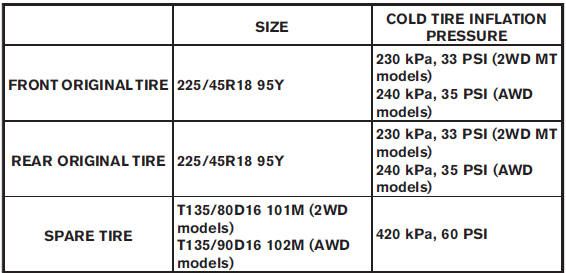 • For additional information regarding tires, refer to “Important Tire Safety Information” (US) or “Tire Safety Information” (Canada) in the Warranty Information Booklet.