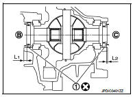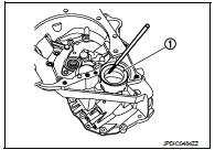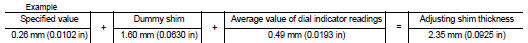 Specified value [0.26 mm (0.0102 in)] + Dummy shim [1.60 mm (0.0630 in)] + Average value of dial indicator readings = Adjusting shim thickness