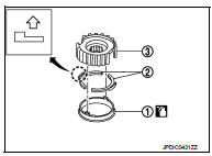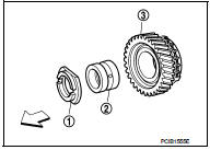 41. Install 5th-reverse baulk ring, synchronizer levers (2), and 5threverse synchronizer hub (3) to 5th input gear.