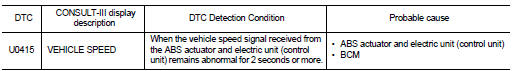 U0415 is displayed if any unusual condition is present in the reception status of the vehicle speed signal from the ABS actuator and electric unit (control unit).