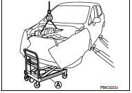Use either 2-pole lift type or separate type lift as best you can. If board-on type is used for unavoidable reasons, support at the rear axle jacking point with a transmission jack or similar tool before starting work, in preparation for the backward shift of center of gravity.