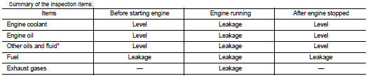 Before starting engine, check oil/fluid levels including engine coolant and engine oil. If less than required quantity, fill to the specified level. Refer to MA-13, "Fluids and Lubricants".