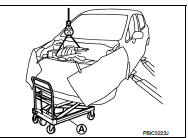 2. Use a manual lift table caddy (commercial service tool) (A) or equivalently rigid tool such as a transmission jack. Securely support bottom of the engine and the transaxle assembly.