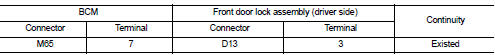 2. Check continuity between BCM harness connector and front door lock assembly (driver side) harness connector.