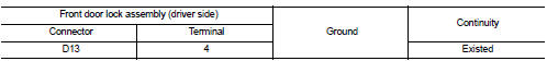Check continuity between front door lock assembly (driver side) harness connector and ground.