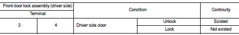 3. Check continuity between front door lock assembly (driver side) terminals.