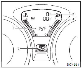 When the ignition switch is placed in the ON position, the vehicle information display shows the following information: 1. Outside air temperature 2. Continuously Variable Transmission (CVT) position indicator (if so equipped) 3. Odometer/Instrument brightness control display 4. Twin trip odometer/Trip computer