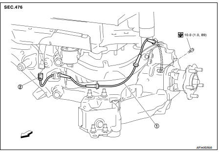 1. Front LH wheel sensor 2. Front LH wheel sensor harness connector